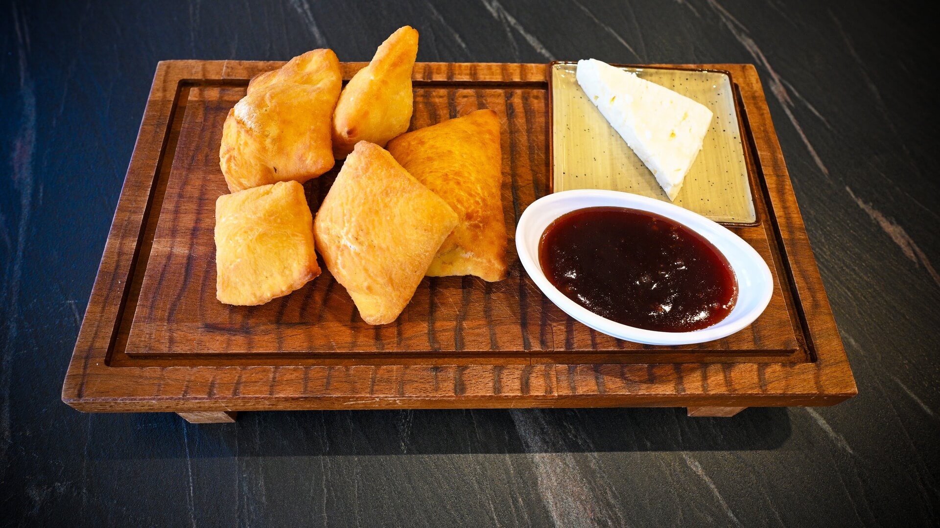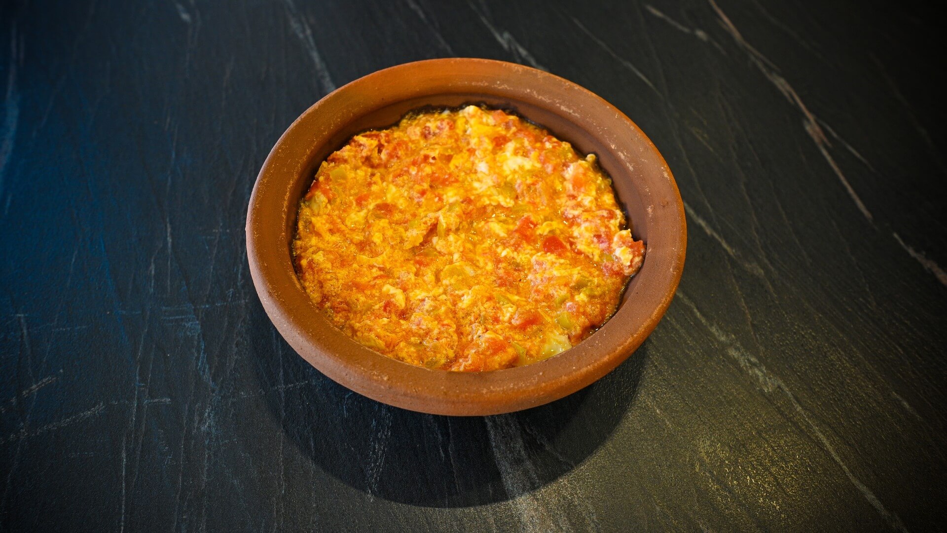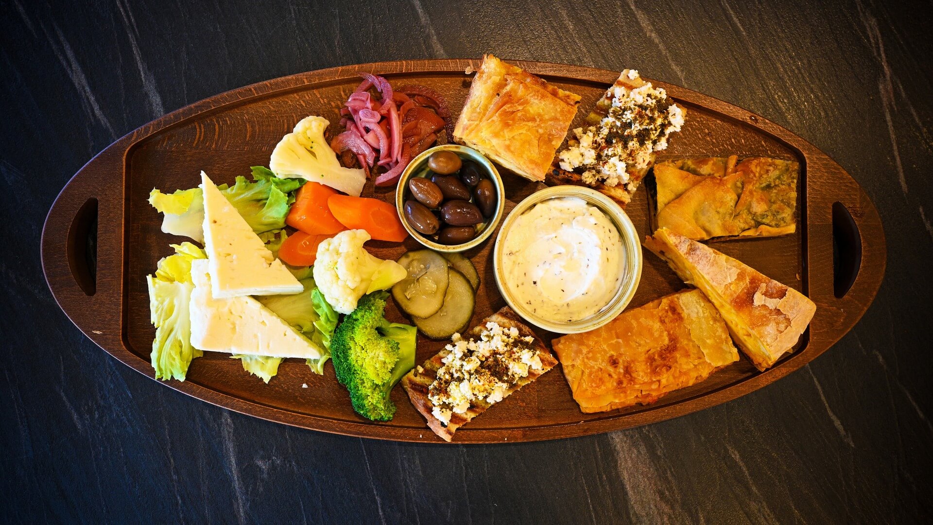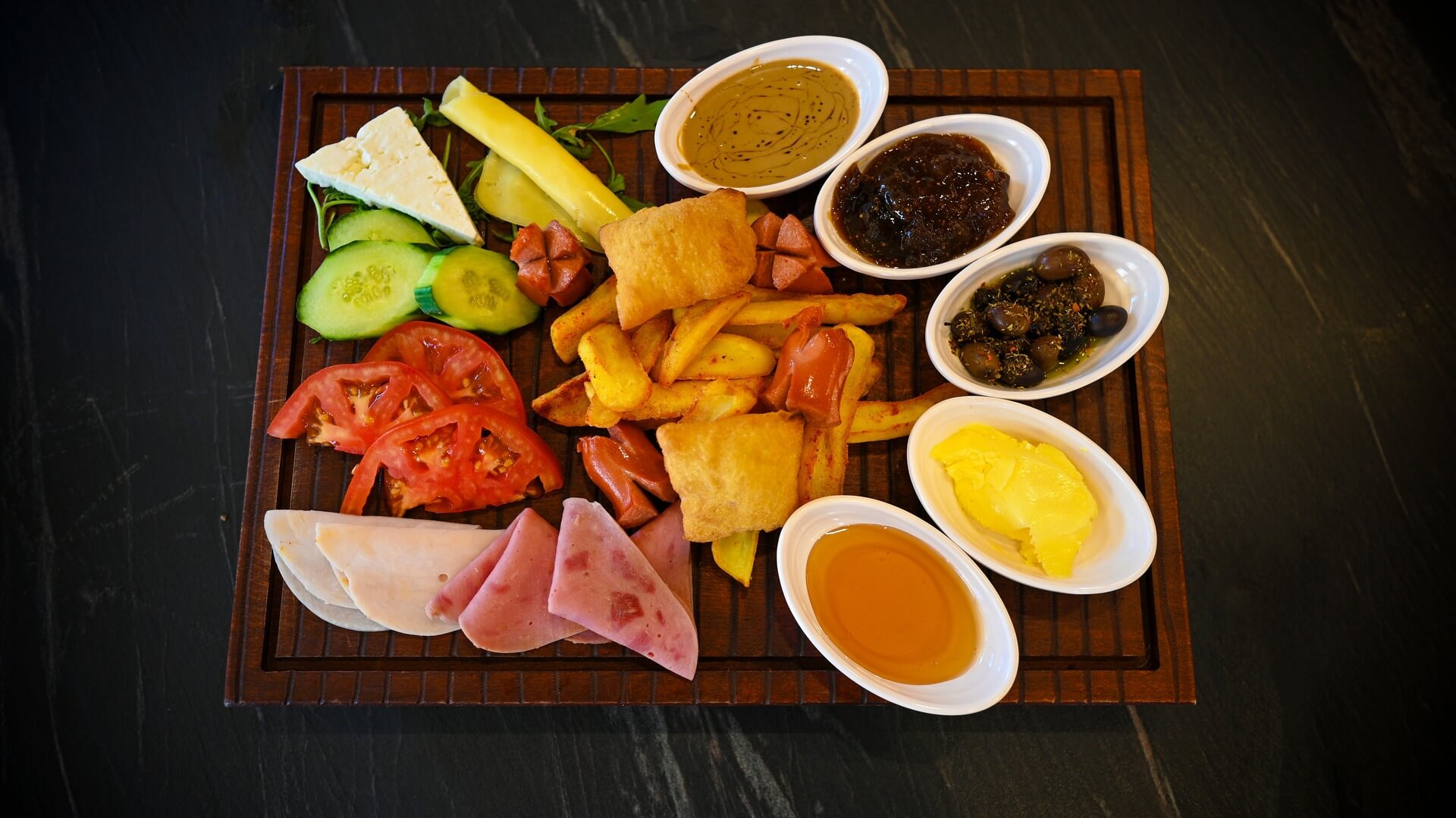 Cheese, olive, jam, butter, tahini, grape molasses, honey, sausage, ham, french fries, eggs (options: fried egg, omelette, menemen)