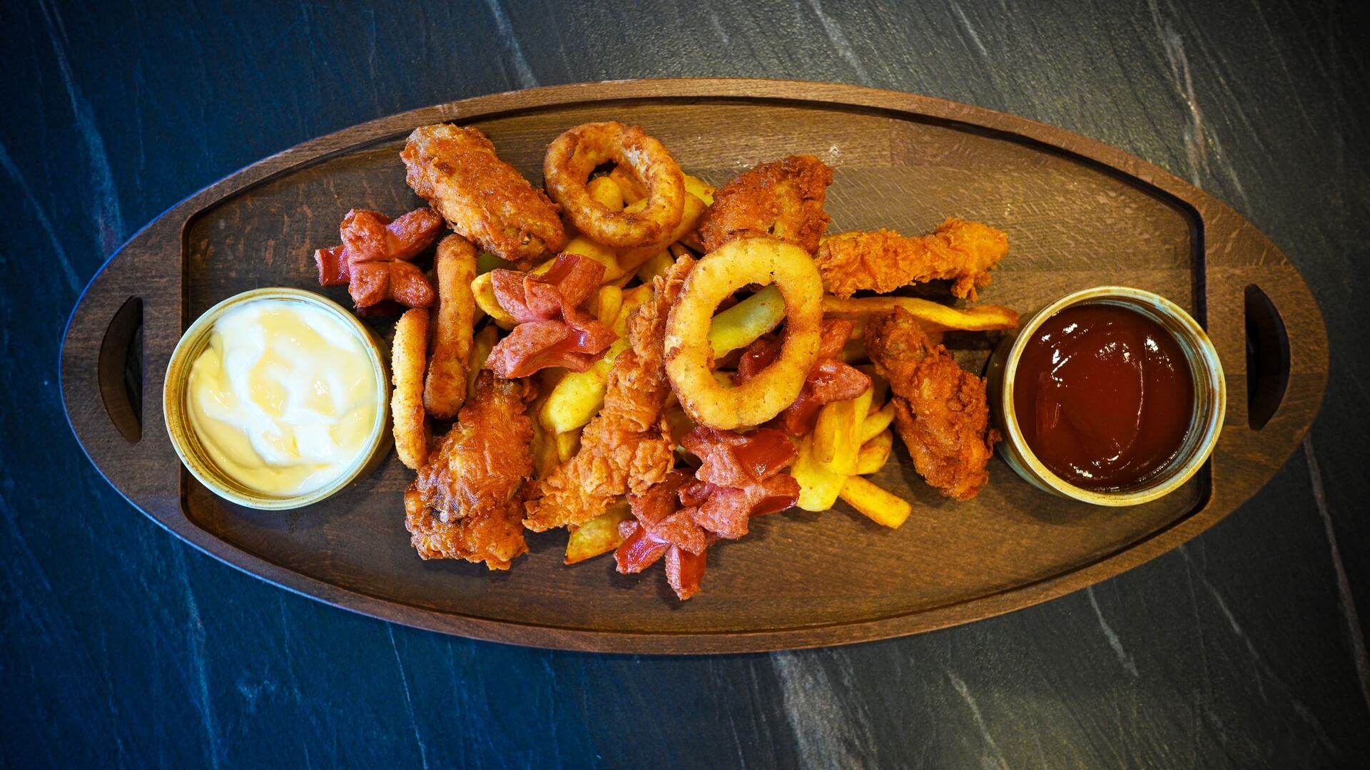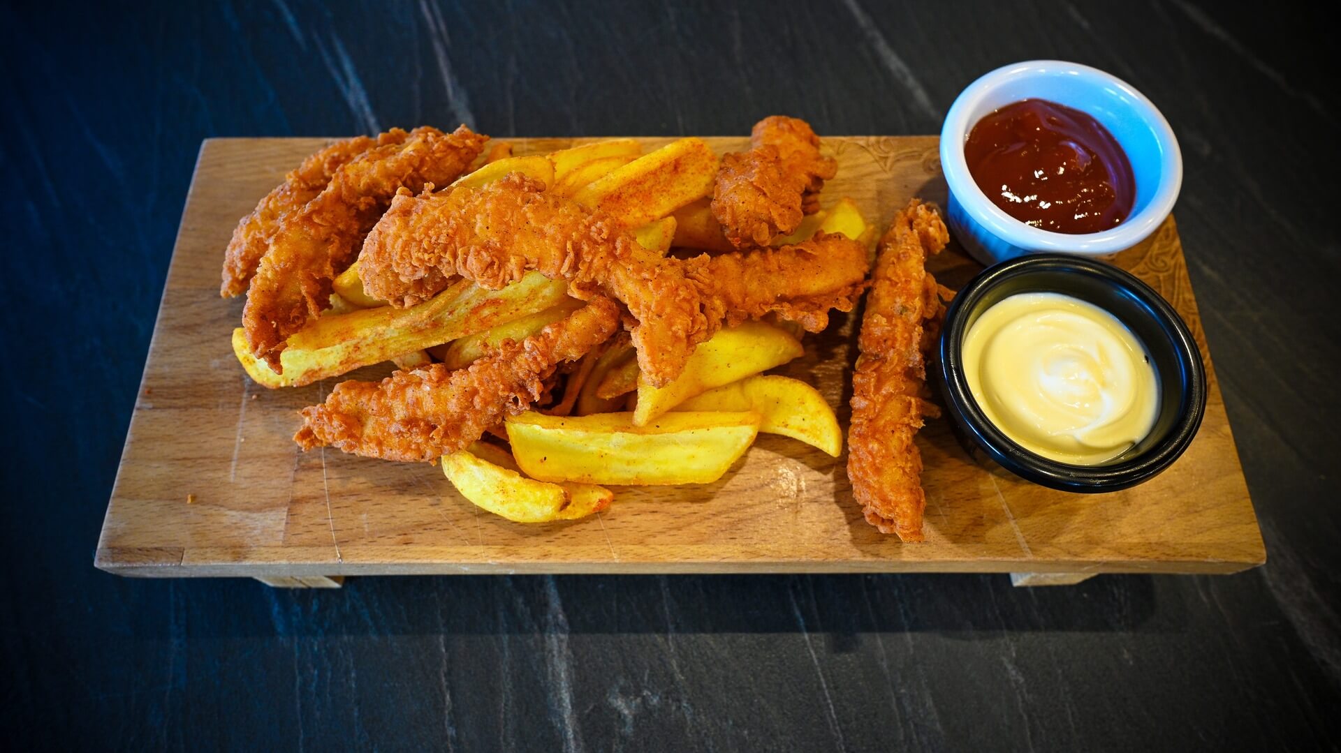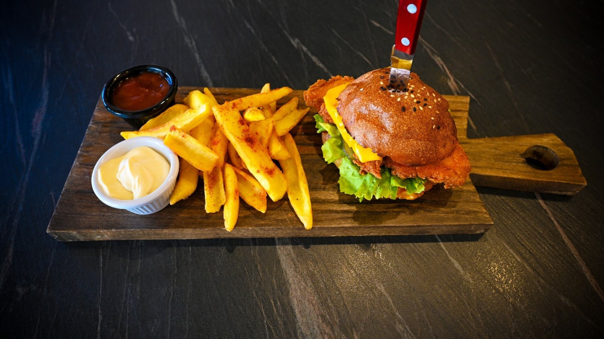 Homemade bun, crispy chicken, lettuce, ranch sauce (mayonnaise, yogurt), pickle, cheddar cheese, French fries