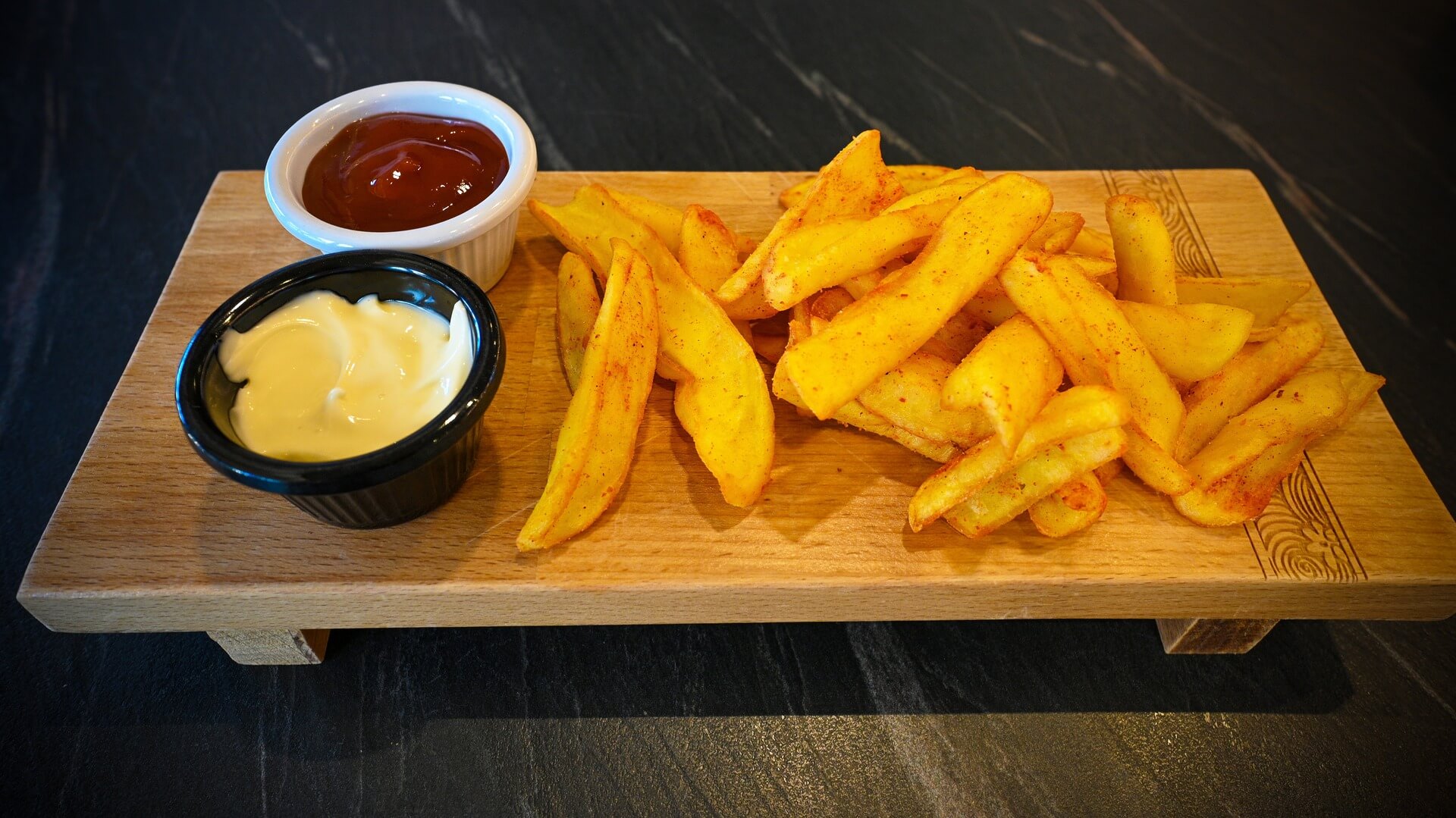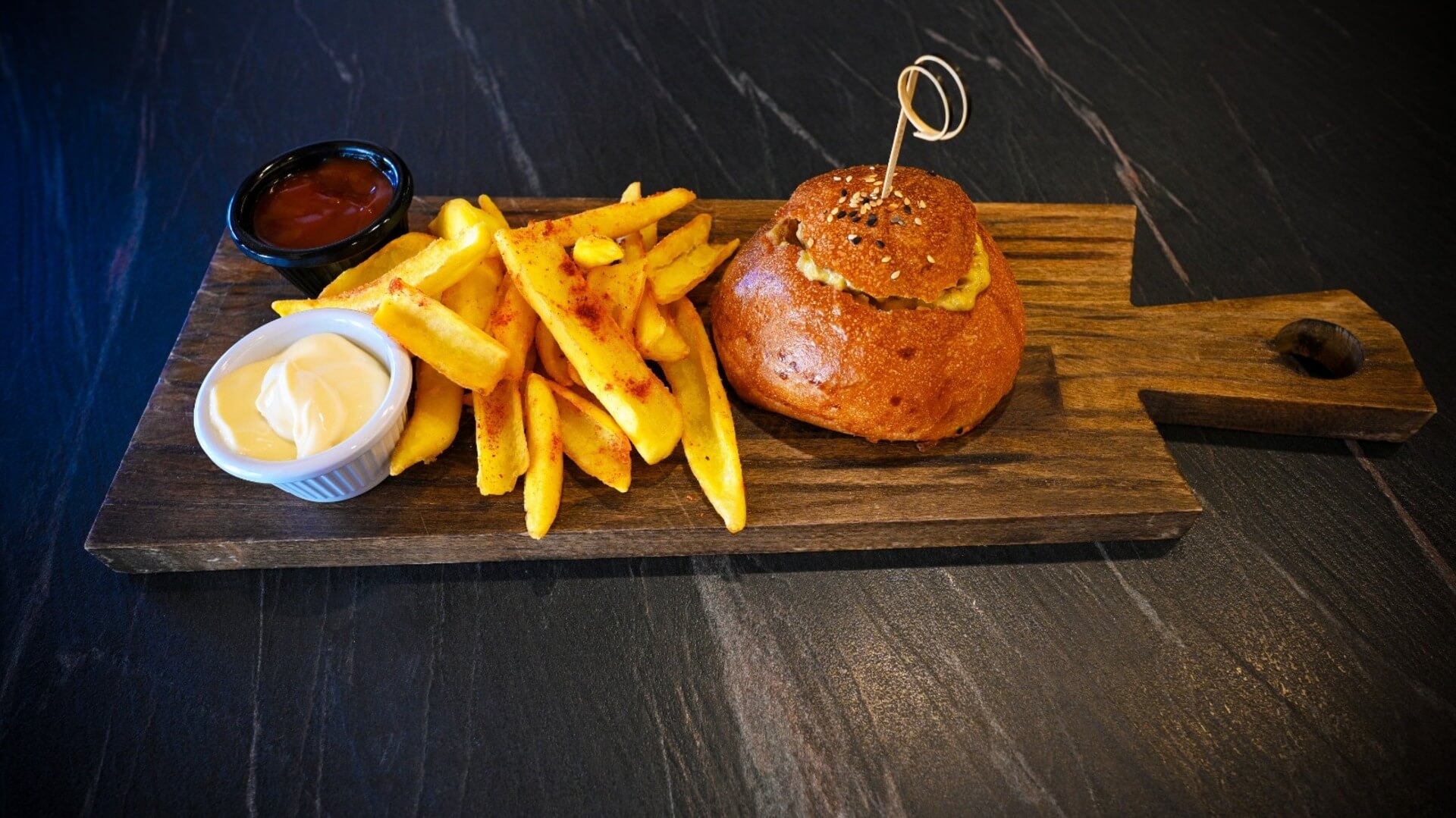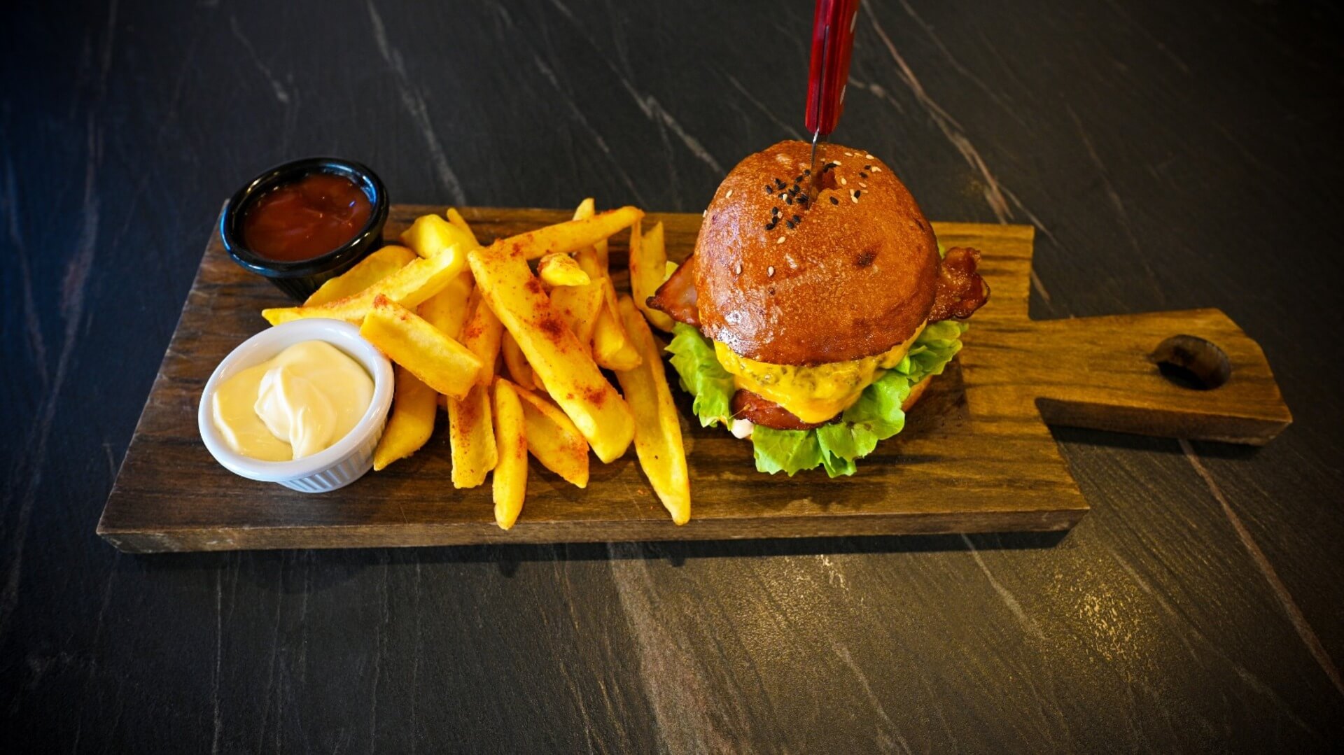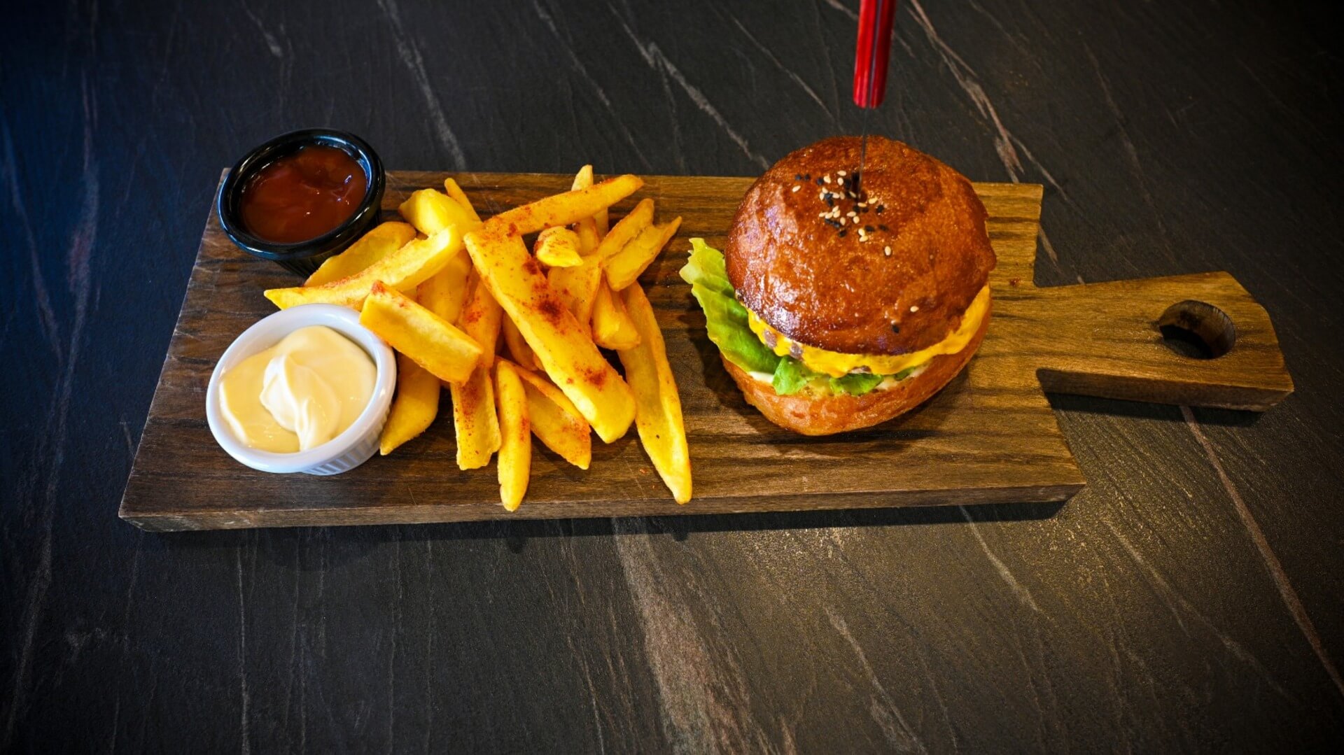 Burger sauce (mayonnaise, mustard with honey), homemade bun, lettuce, cucumber, pickle, tomato, crispy onion, beef patty, cheddar cheese, French fries
