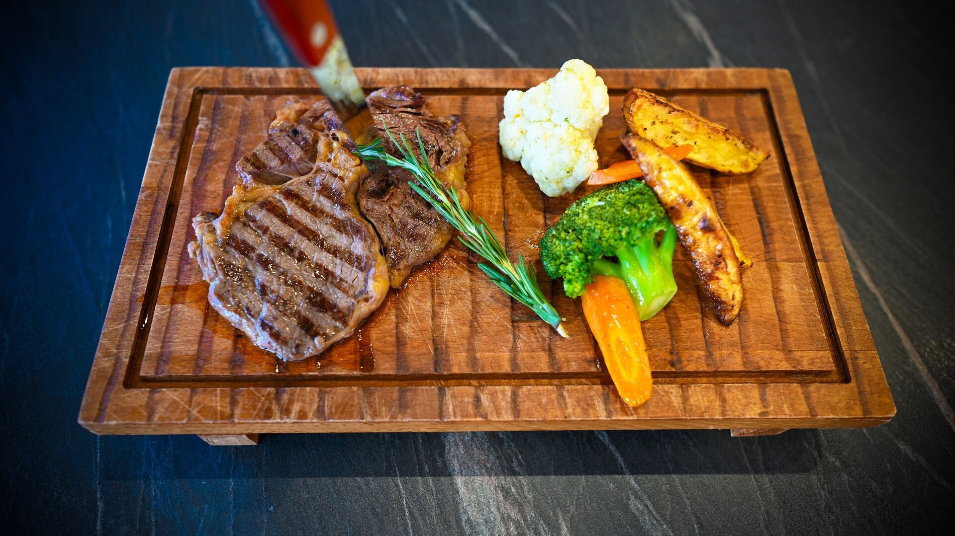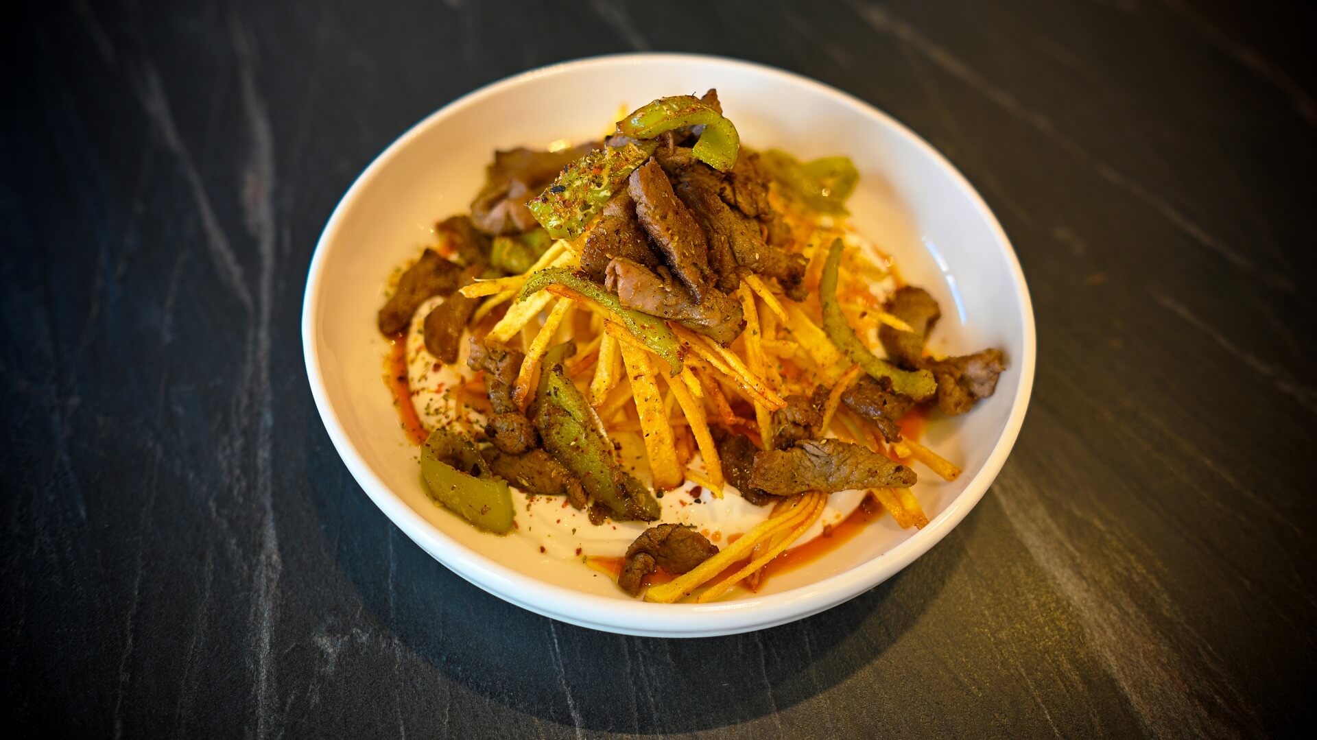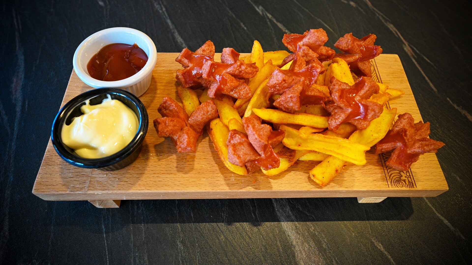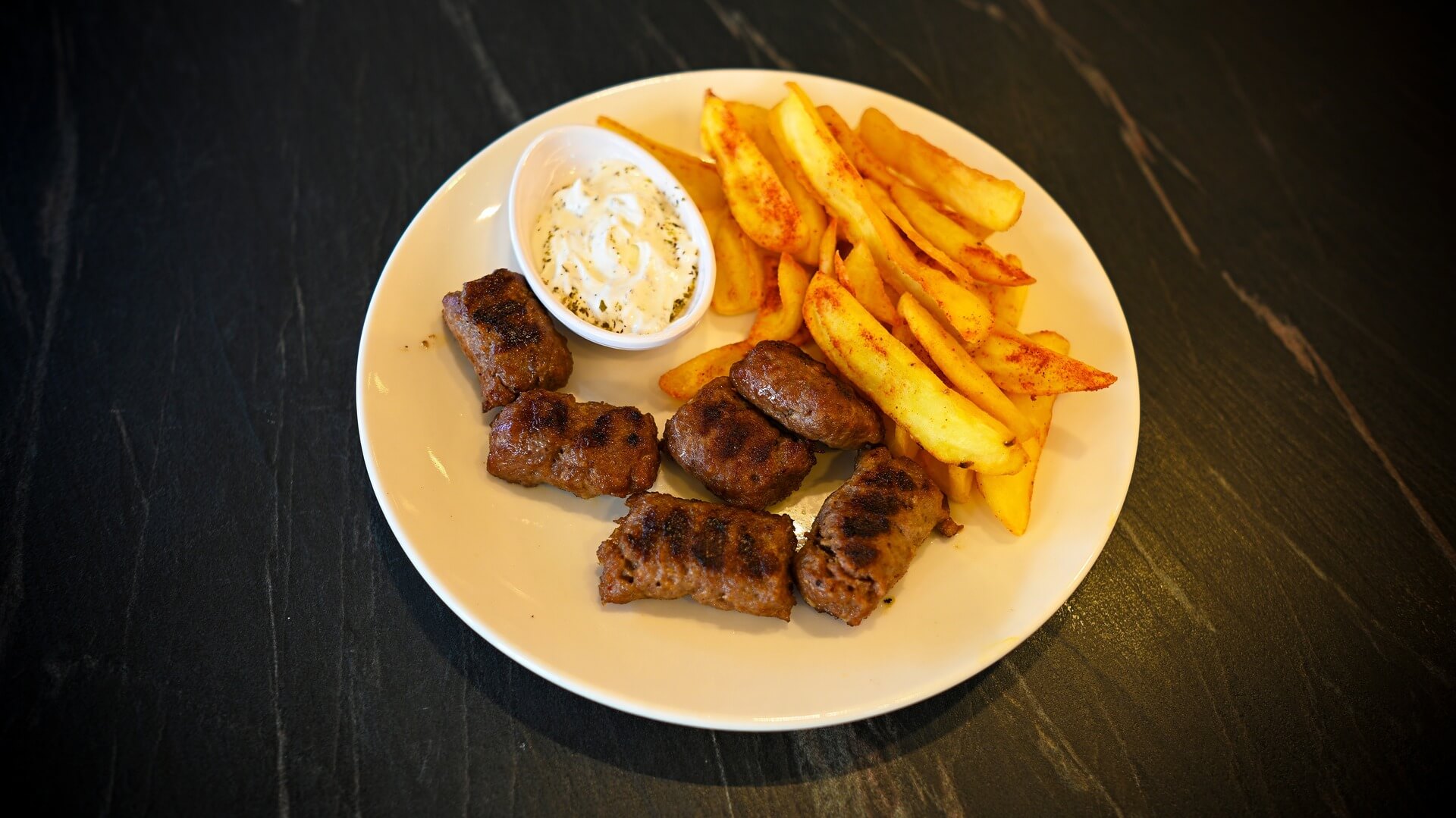 Burger sauce (mayonnaise, mustard with honey), homemade bun, lettuce, cucumber, pickle, tomato, crispy onion, beef patty, cheddar cheese, French fries