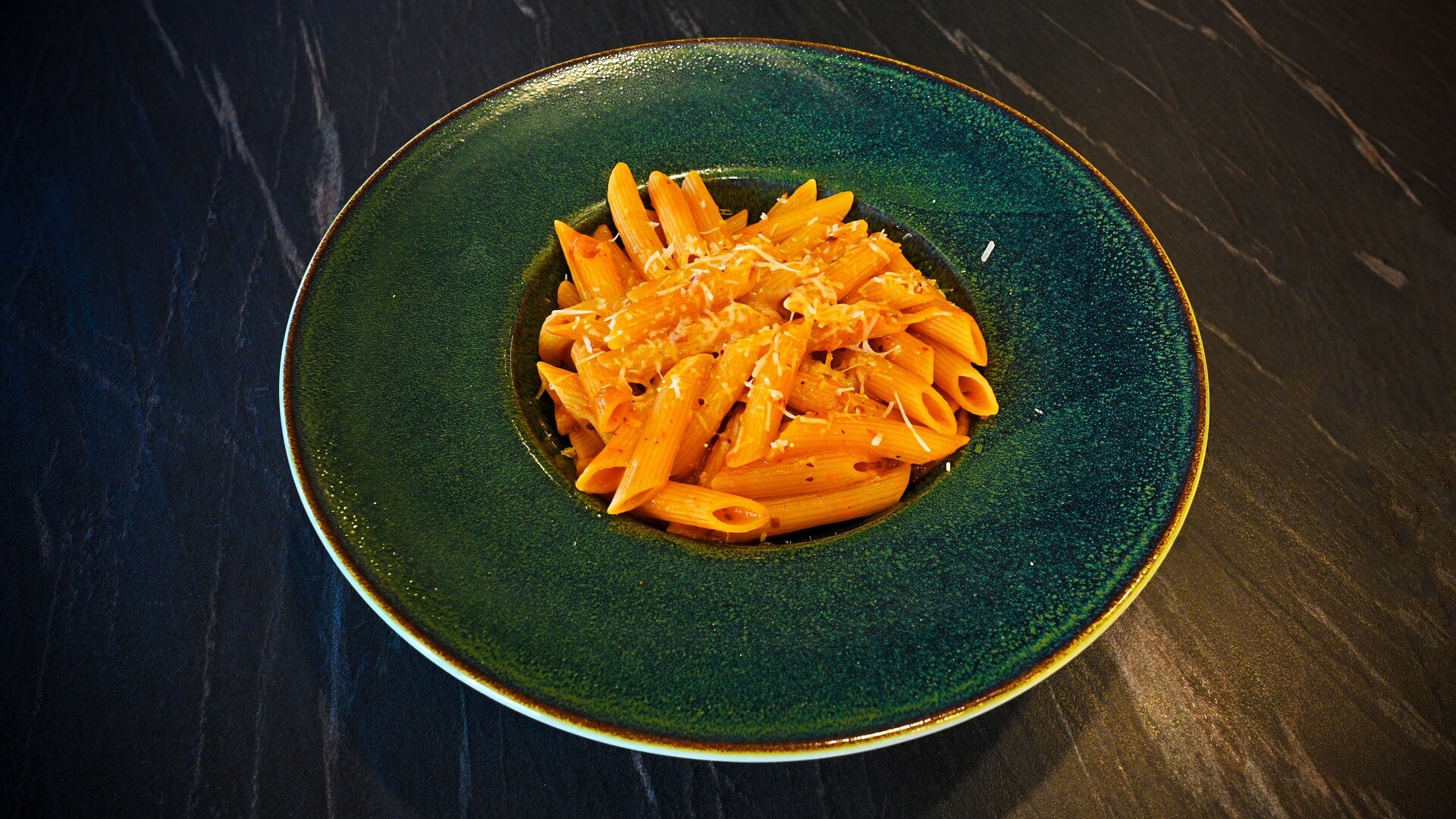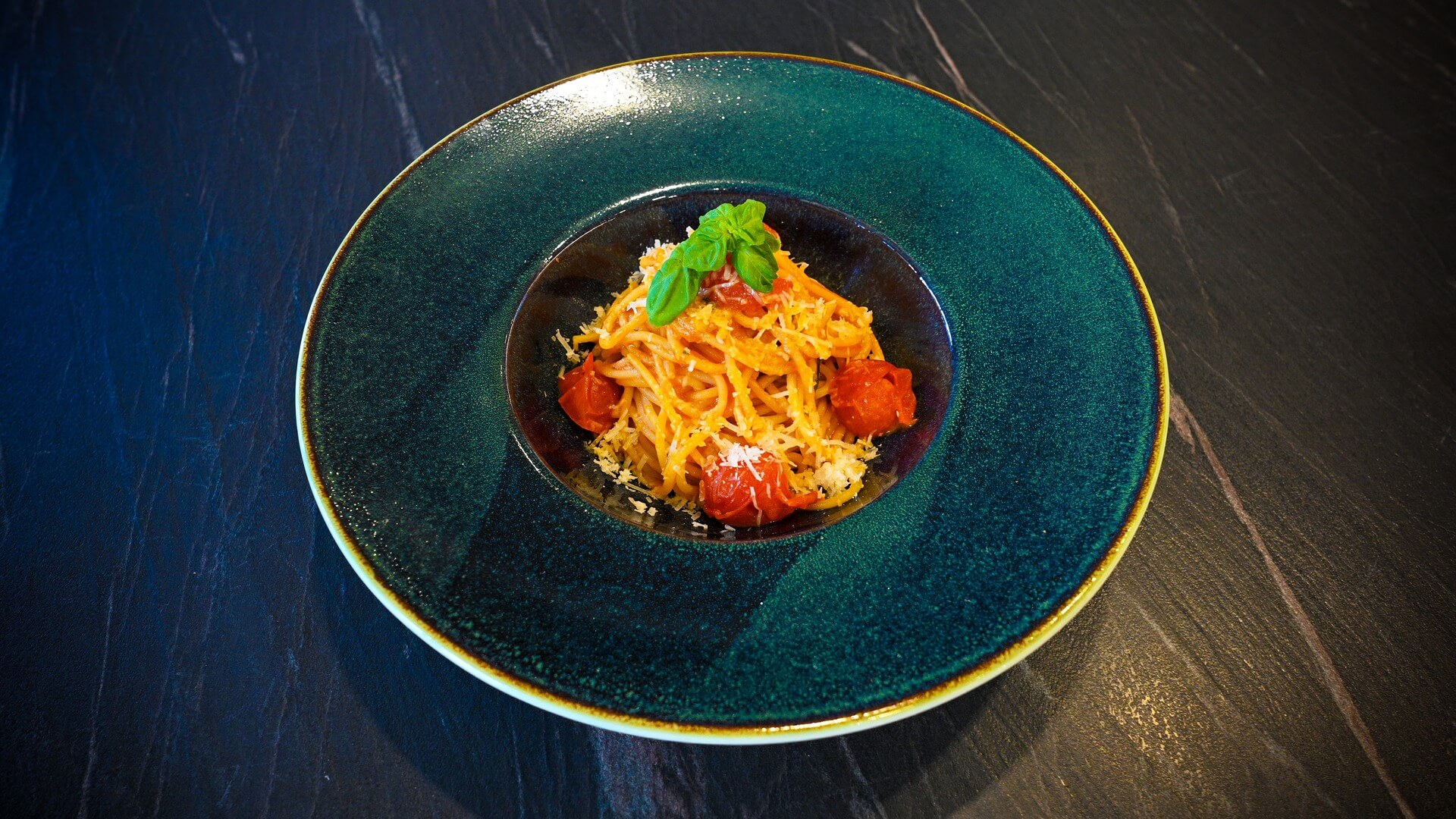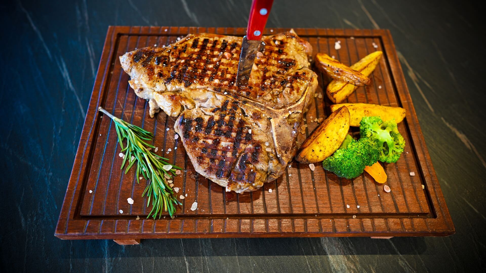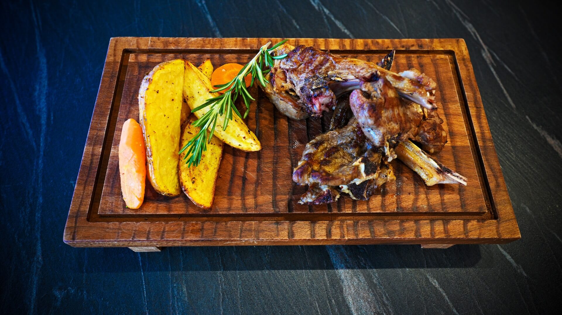 Burger sauce (mayonnaise, mustard with honey), homemade bun, lettuce, cucumber, pickle, tomato, crispy onion, beef patty, cheddar cheese, French fries